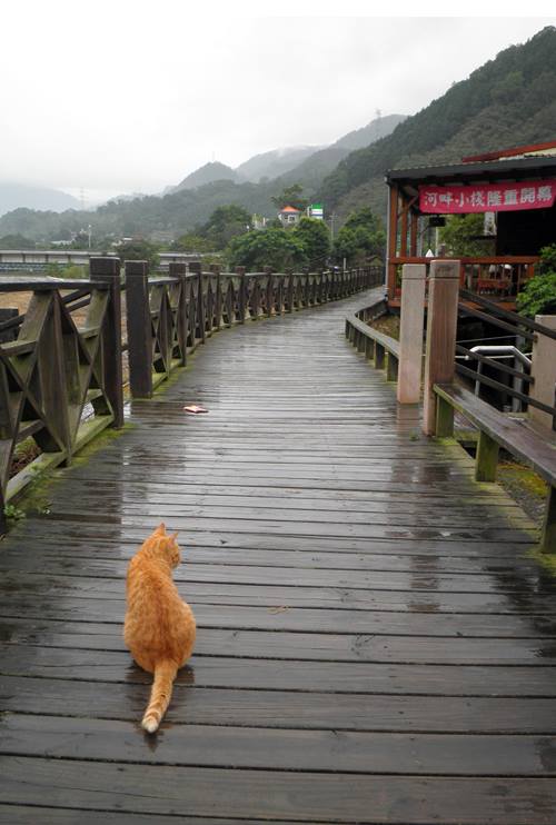 那天跟同學一起到南庄老街逛逛,過了康濟吊橋,在細雨中遇到一隻小橘貓,悠哉的沿著蓬萊溪畔的木棧道漫步過來,我出聲招呼牠,牠一點也不怕生的靠近,聞著我手裡的塑膠袋,想來是希望能有些吃的。